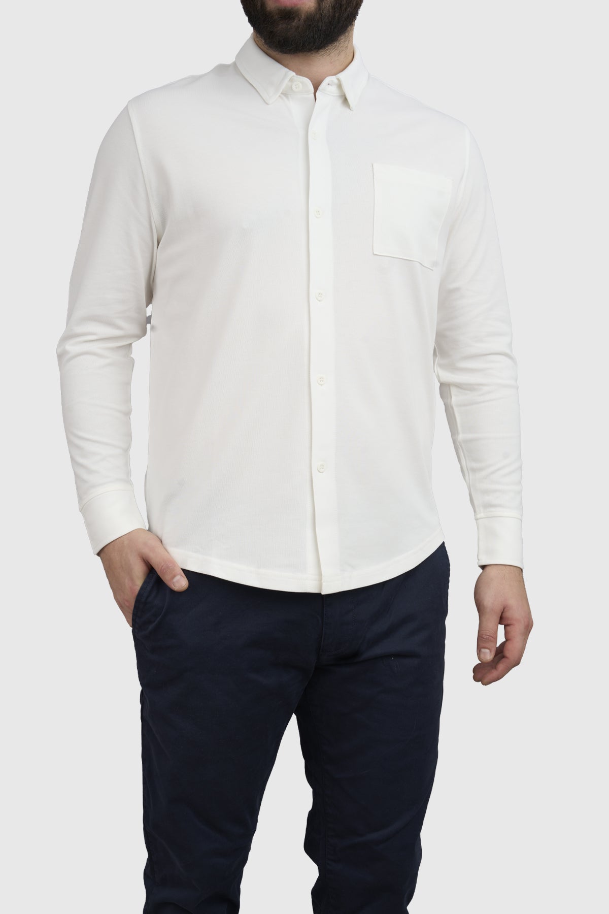 Our Performance Piqué Long Sleeve Button-Down Shirt is the ultimate comfort-first choice for shorter guys who value both style and practicality. Designed with a slim fit through the arms and a relaxed cut in the body, it offers a modern look without sacrificing breathability or ease of movement. Made from pique knit fabric (similar to classic polo shirts) this shirt provides a textured, lightweight feel that keeps you comfortable throughout the day. It's great for commuters or those working from home that need something professional but comfortable.
