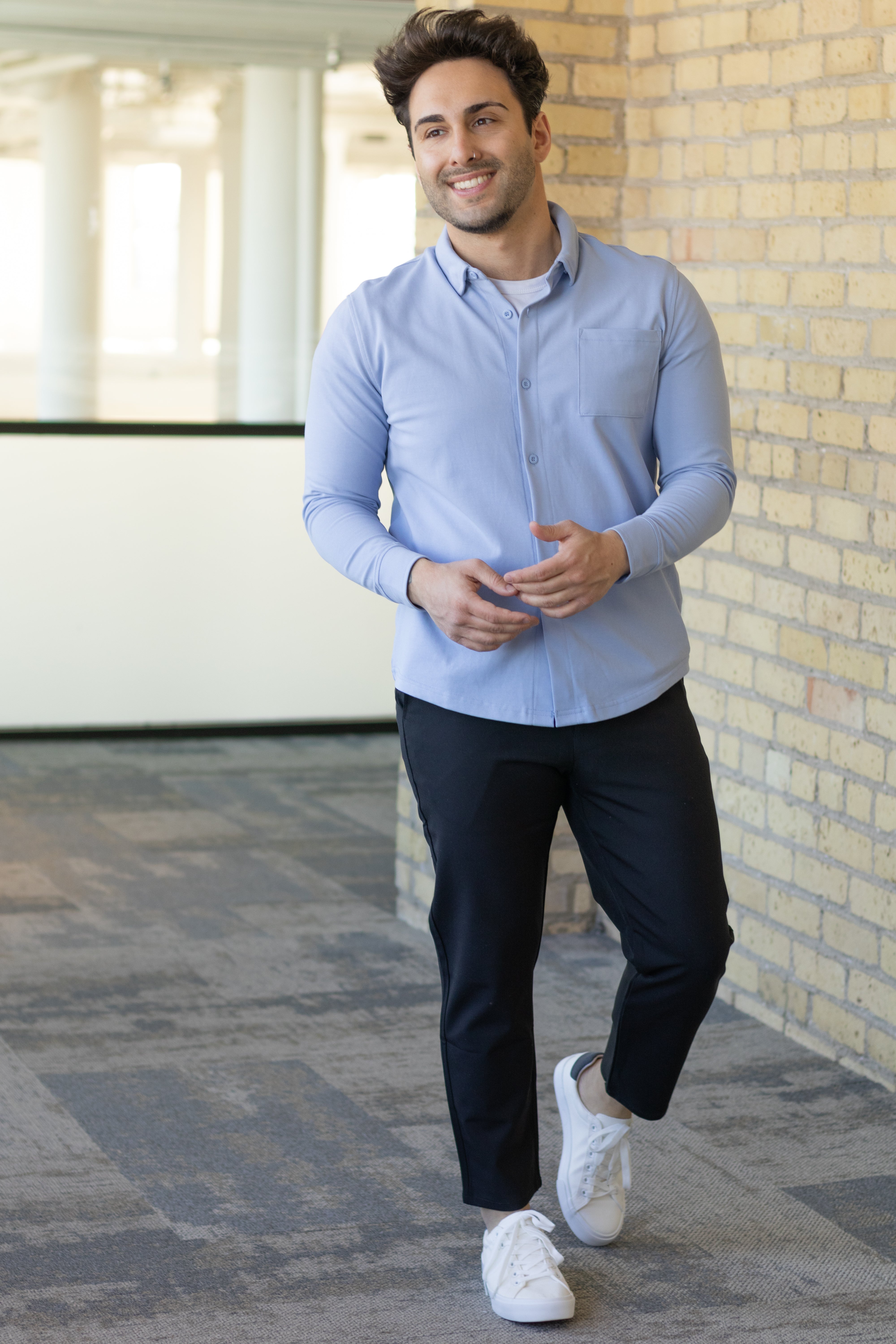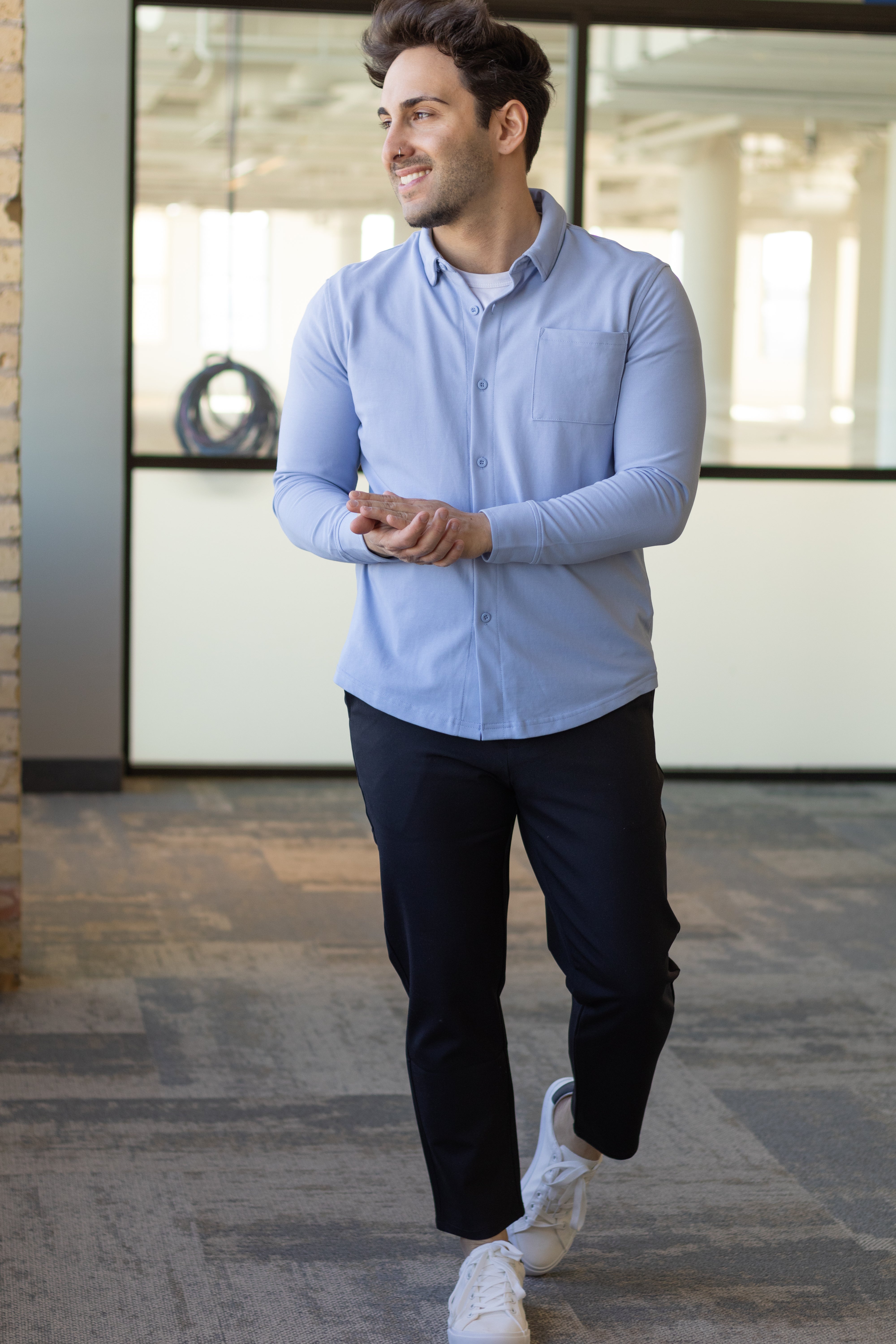 Our Performance Piqué Long Sleeve Button-Down Shirt is the ultimate comfort-first choice for shorter guys who value both style and practicality. Designed with a slim fit through the arms and a relaxed cut in the body, it offers a modern look without sacrificing breathability or ease of movement. Made from pique knit fabric (similar to classic polo shirts) this shirt provides a textured, lightweight feel that keeps you comfortable throughout the day. It's great for commuters or those working from home that need something professional but comfortable.